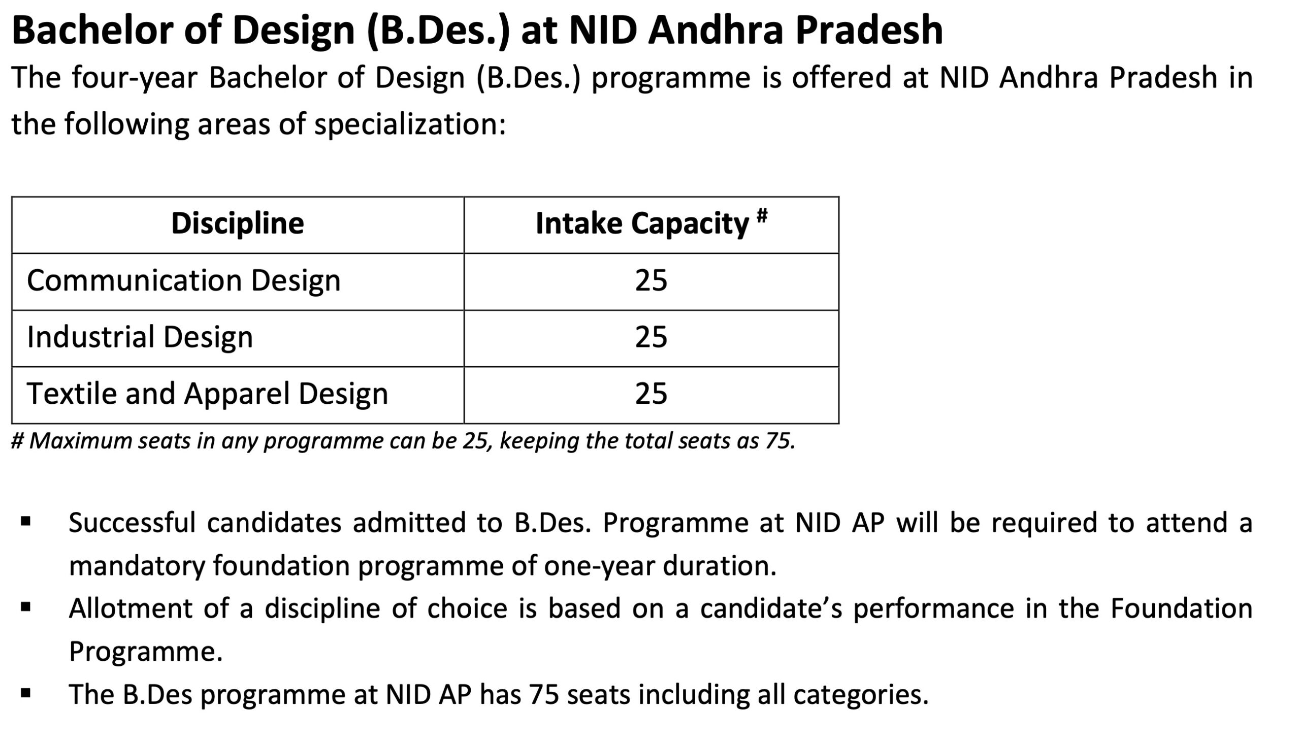 | NID Campuses | Ahmedabad, Gandhinagar, Bengaluru, Andhra Pradesh, Haryana, Madhya Pradesh, Assam |