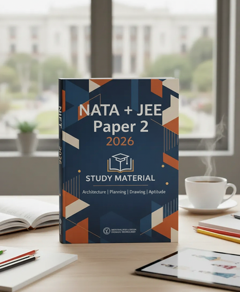 Prepare for NATA and JEE Paper 2 with focused booklets on architecture aptitude and awareness, general reasoning, mathematics, physics & chemistry, general aptitude, drawing, previous‑year papers and a combined guide book, along with a drawing file and colour kit.